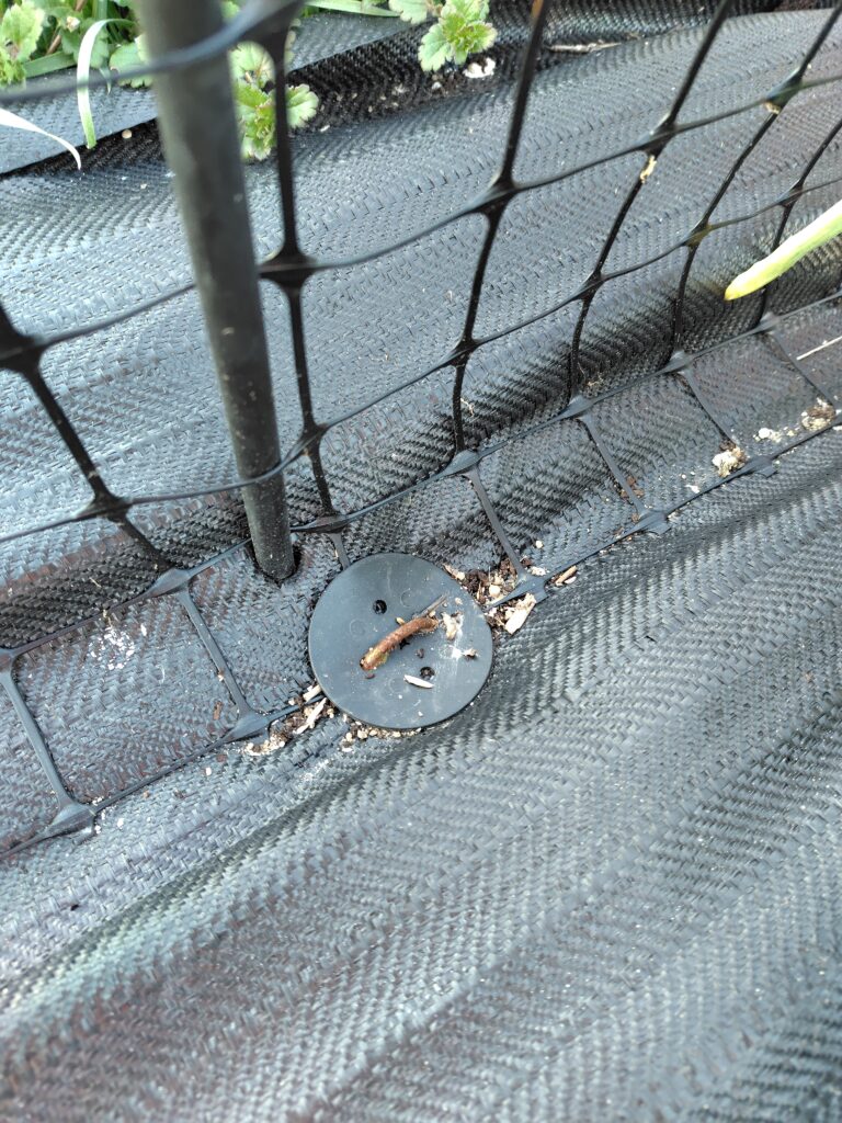 ネットのマス目に、支柱を交互にくぐらせて、最後のマス目を果樹園の外側に向くように曲げて、黒丸くんで固定していきます。